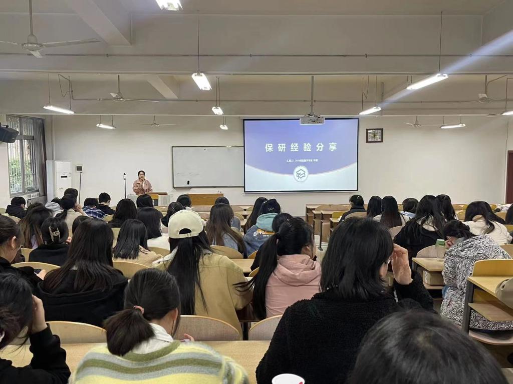 会上,牛颖讲述了自己的保研经历,在经历积极报名、准备材料、努力备战、面试等过程之后,现已成功推免至厦门大学经济学院统计学专业攻读硕士研究生。她从推免流程、投递策略、保研准备等方面进行了分享,并重点介绍了保研准备部分。最后,牛颖为有意向保研的同学提出了切实可行的建议,她鼓励大家突破自我、超越自我,勇敢追求光明未来。