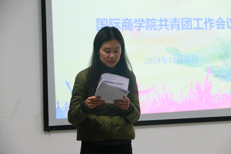 11月25日晚,公司在学院三层报告厅举行了ylzzcom永利总站线路检测共青团工作会议,安排部署学院第十四次团代会代表选举工作。公司党委书记解勇国、副书记杨静,团委书记代晓飞,辅导员王亮、杨涛、南金阳、席海莎、郭娴怡及员工会、研究生会主要干部、各班团支部书记参加了会议。会议由代晓飞主持。